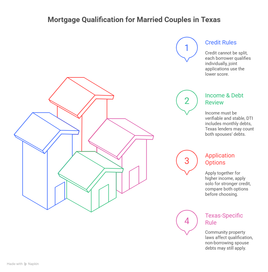 If both spouses apply together for a joint mortgage, lenders evaluate both credit profiles and combined income. If only one spouse applies, the lender reviews that spouse’s credit and income, with additional Texas-specific considerations.